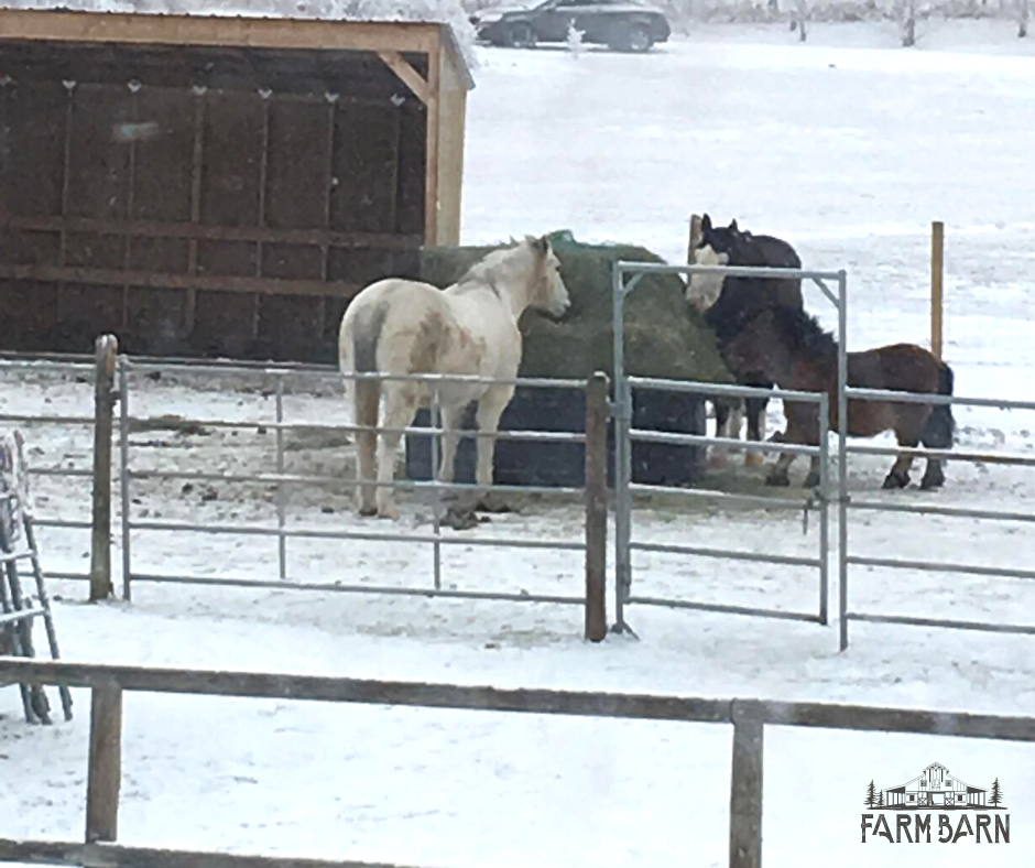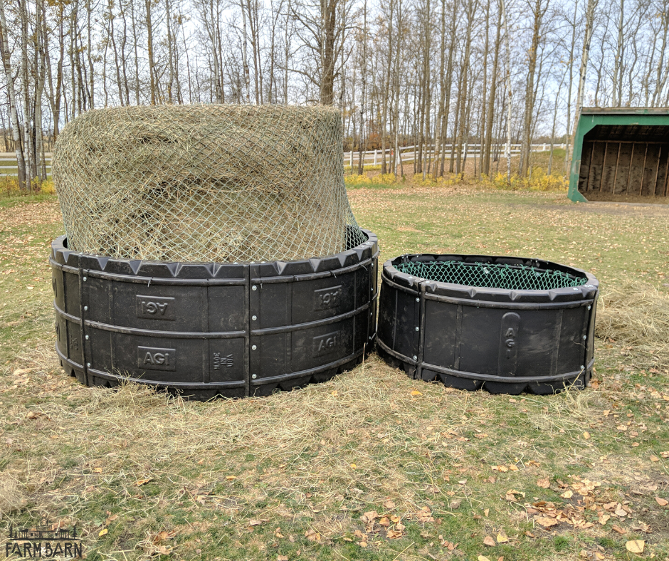 A mini poly hay ring with a NAG Bag slow feeder net attached. Only 24 inches in height, making them perfect for feeding ponies, donkeys, mixed small herds, boarding facilities, or to protect the hay from being wasted. This system saves hay, time and money. Available with 1.5", 2" and 2.75” net. Adjustable and used for all bale sizes, including small square bales.